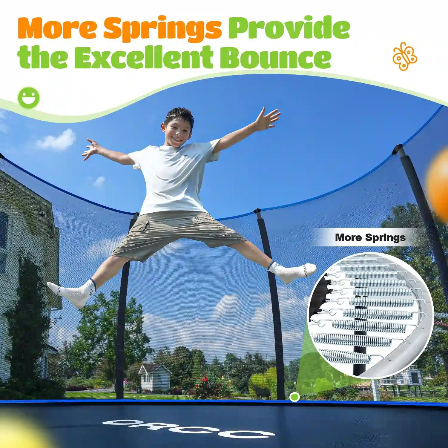 More Materials & Safer Design】ORCC trampoline has added an extra ribbon at the bottom of the safety net, covering the gap between the jumping mat and the net, which prevents children from being injured by the springs. We believe that the extra materials used for this design are worth it, as it provides a better bouncing experience for children, allowing them to immerse themselves in the joy of jumping and stay away from worries.