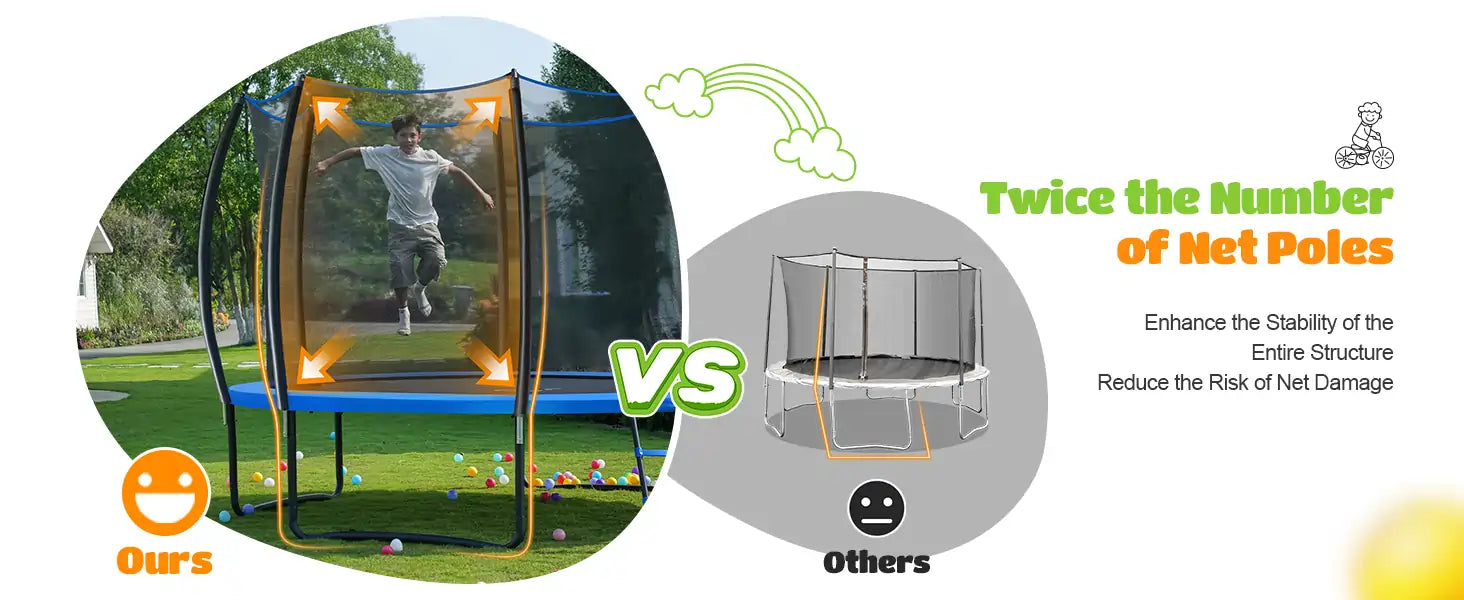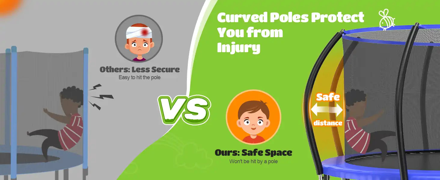 Safer Structure】The upgraded ORCC trampoline features curved and thickened foam-wrapped safety poles, which increase the distance between jumpers and safety poles to prevent injuries caused by collision. Additionally, trampolines with curved safety poles provide better stability to the structure and it is not easy to roll over during the jumping process. Moreover, the reinforced safety net provides better support and can firmly hold the jumper.